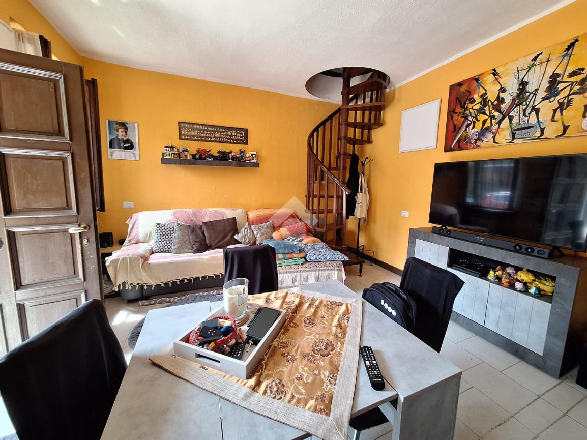 L’ingresso si apre sulla zona giorno, composta dal soggiorno con cucina a vista. Una scala interna conduce al piano superiore, dove si trova la camera matrimoniale con accesso al balcone e ad un locale finestrato, ideale come studio o cabina armadio ed il bagno finestrato con vasca.