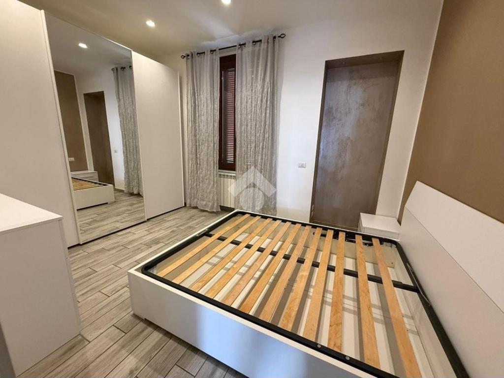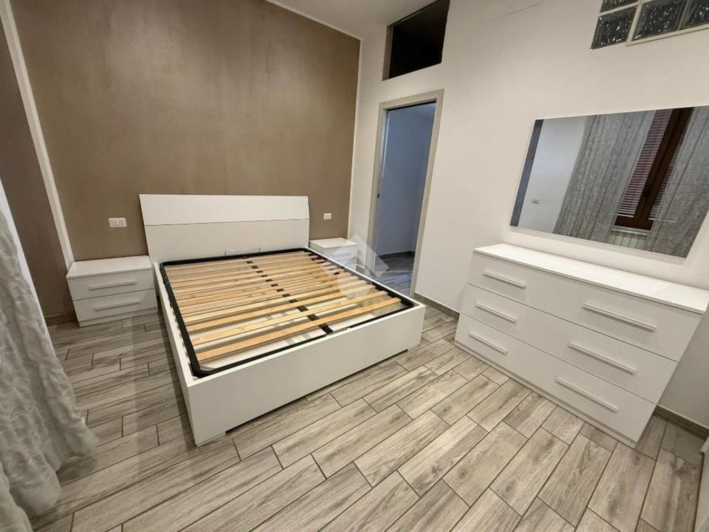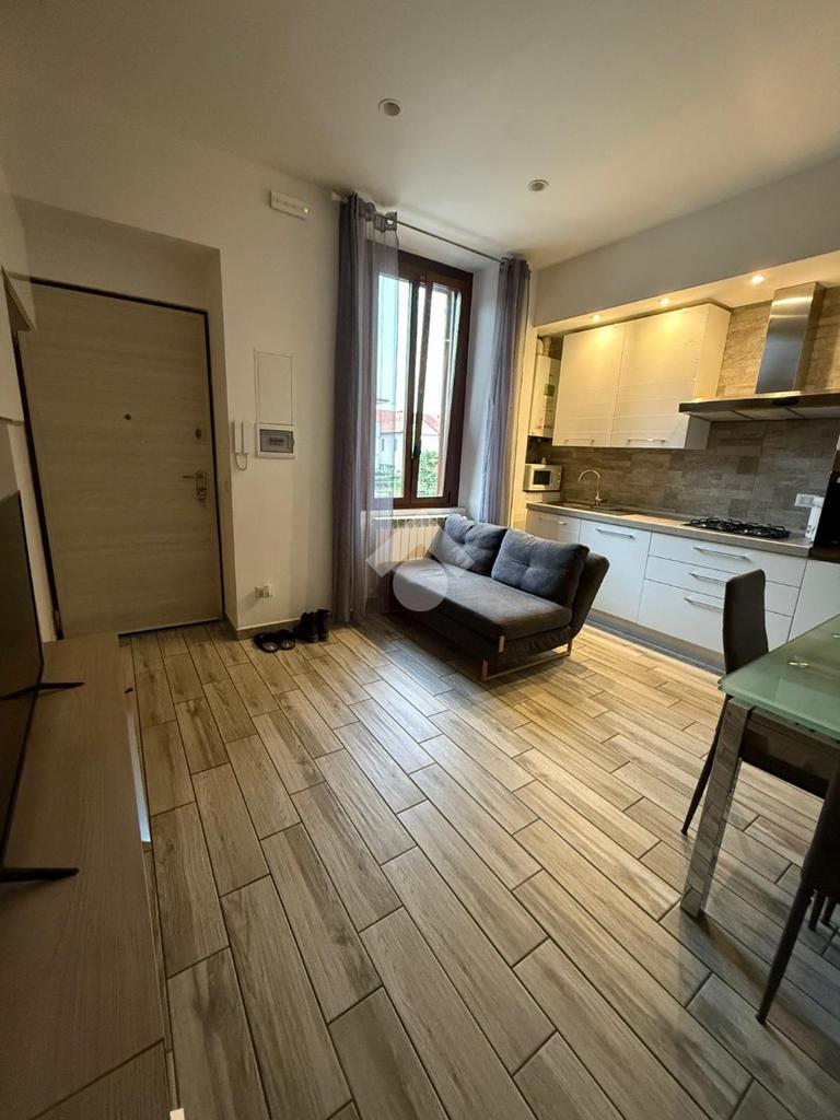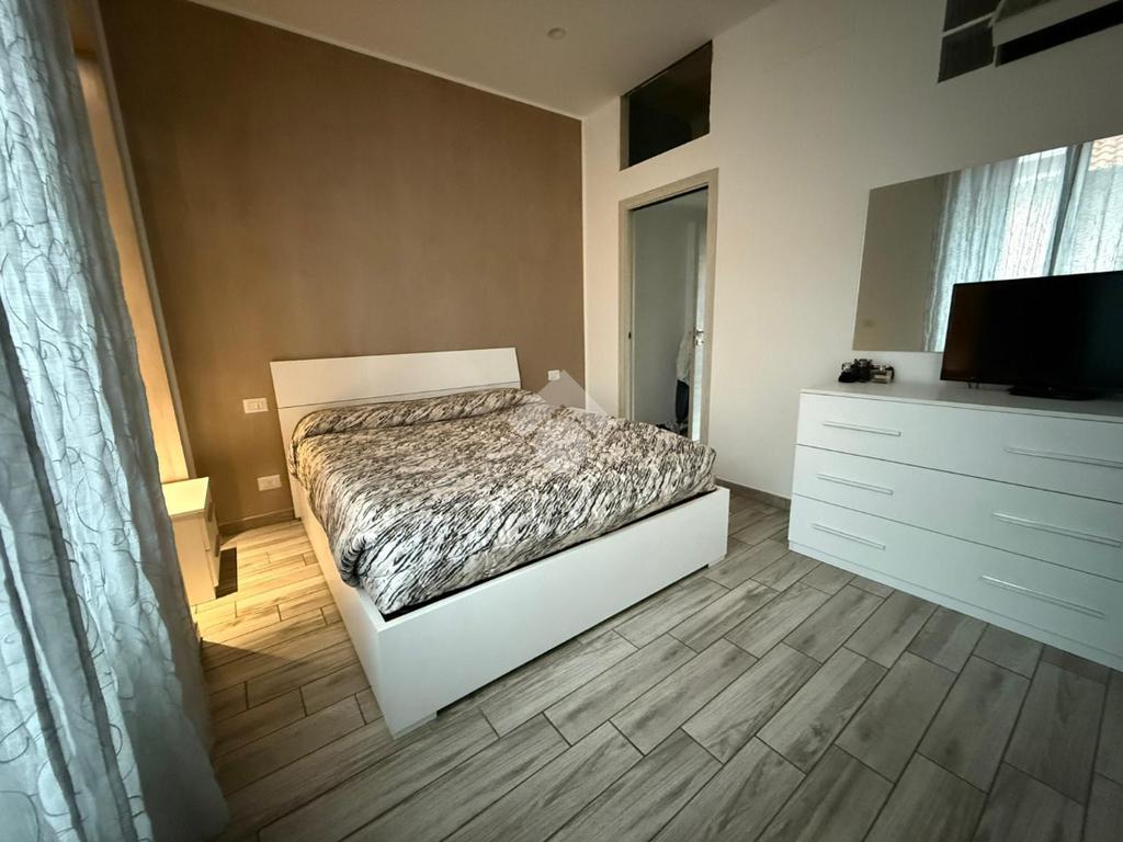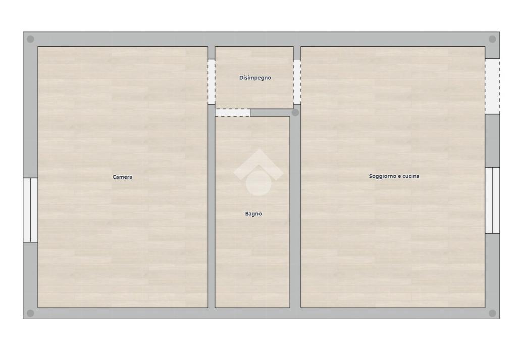L'ingresso si apre su una zona giorno open space con cucina a vista. Un comodo disimpegno conduce alla camera da letto matrimoniale e al bagno, dotato di box doccia.