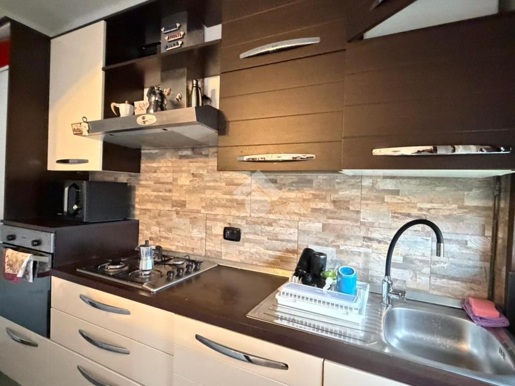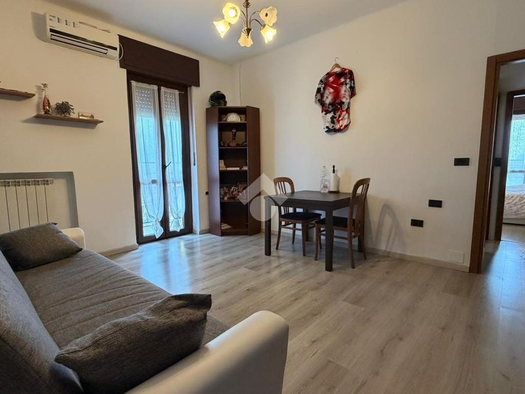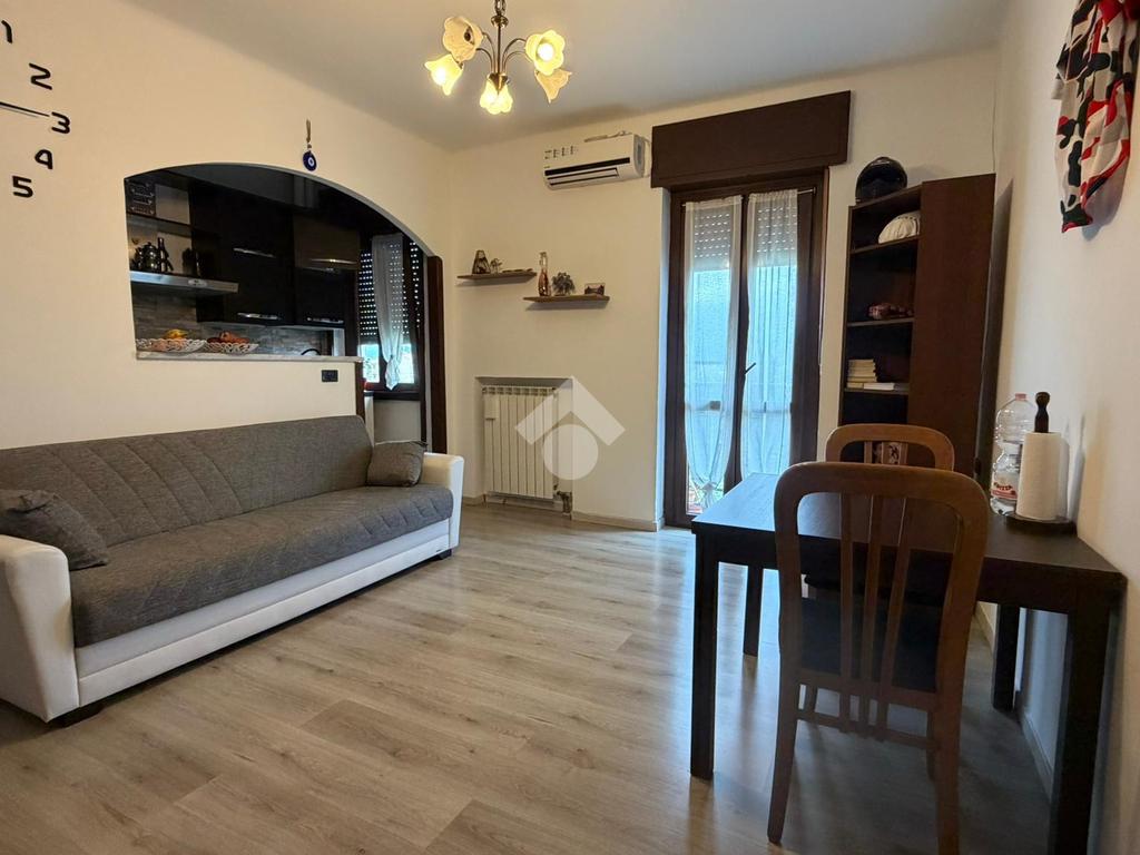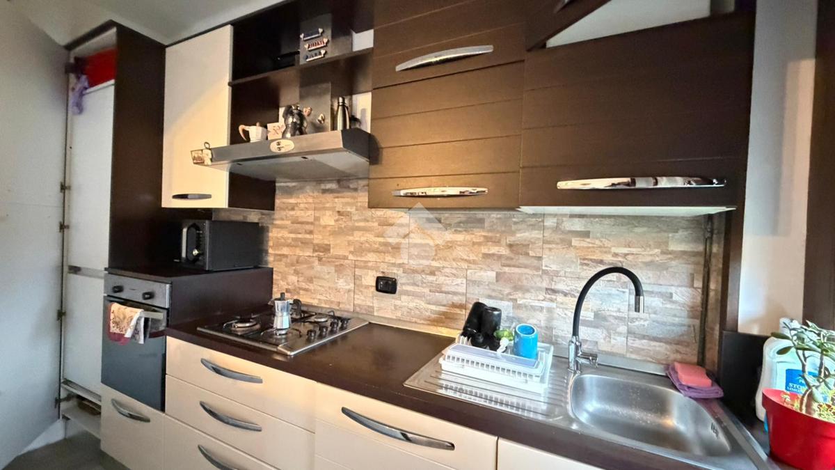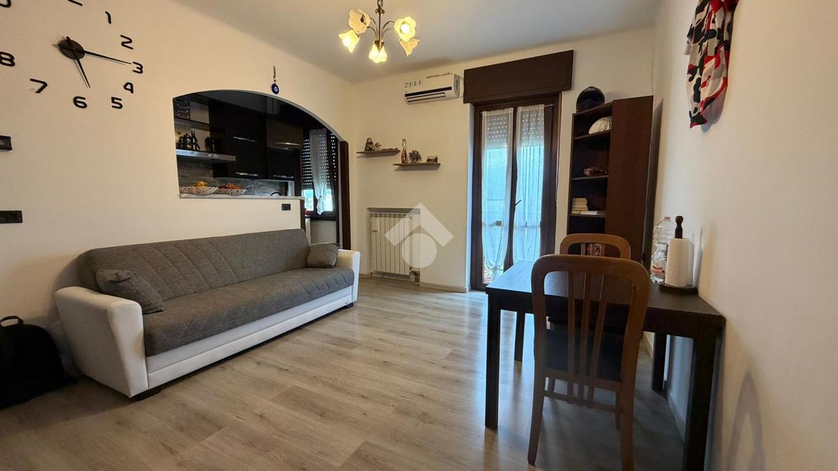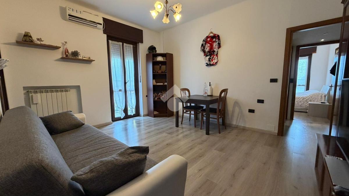 L’ingresso si apre su un accogliente soggiorno con accesso al balcone, affiancato da un pratico cucinotto separato.